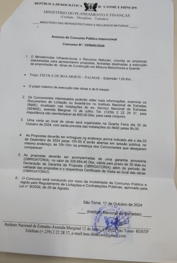 O Ministério das Infraestruturas e Recursos Naturais convida as empresas para apresentação de propostas para a execução das empreitadas de obras de construção em mistura betuminosa a quente do troço de estrada que liga a escola de Boa Morte a Palmar, numa extensão de 1,05 quilómetros.