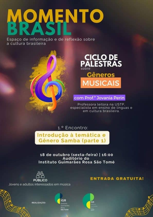 O Instituto Guimarães Rosa São Tomé tem a satisfação de convidá-lo(a) para o “Momento Brasil”, um espaço dedicado à informação e reflexão sobre a cultura brasileira. Nesta semana, daremos início a um ciclo de palestras que explorarão os gêneros musicais do Brasil. Vamos discutir aspectos históricos e características dos diversos estilos musicais, além de desfrutar de belas canções!