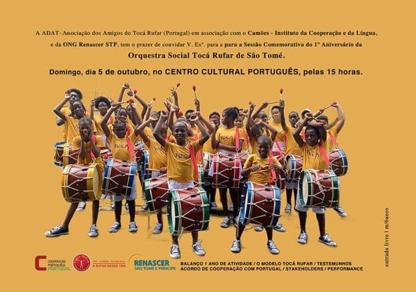 A ADAT – Associação dos Amigos do Tocá Rufar, em colaboração com a Cooperação Portuguesa e a ONG Renascer STP, tem a honra de convidar o público . Exa. ara a Sessão Comemorativa do 1º Aniversário da Orquestra Social Tocá Rufar de São Tomé e Príncipe.