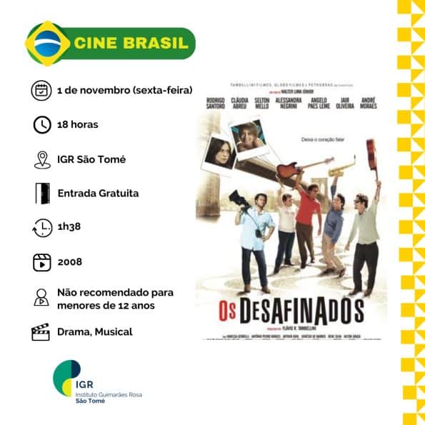 O Instituto Guimarães Rosa São Tomé tem a satisfação de convidá-lo(a) para a próxima sessão do Cine Brasil, marcada para o dia 1.º de novembro (sexta-feira), às 18h. Na sessão será exibido o filme “Os Desafinados”, uma produção brasileira de 2008, dirigida por Walter Lima Junior. No longa, Rodrigo Santoro, Selton Mello, Ângelo Paes Leme, Jair Oliveira e André Moraes interpretam cinco amigos músicos que formam o projeto musical Bossa Cinco. O elenco também conta com a presença de Cláudia Abreu, Alessandra Negrini e Vanessa Gerbelli.