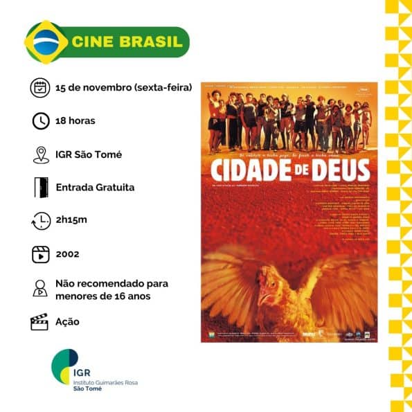 O Instituto Guimarães Rosa São Tomé tem a satisfação de convidar para a próxima sessão do Cine Brasil, a ser realizada no dia 15 de novembro (sexta-feira), às 18h. Na sessão será exibido “Cidade de Deus“, filme de ação brasileiro de 2002, produzido pela O2 Filmes, Globo Filmes e VideoFilmes. O filme é uma adaptação roteirizada por Bráulio Mantovani a partir do livro de mesmo nome escrito por Paulo Lins.