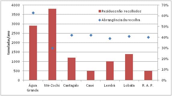 Considerando a abrangência dos sistemas de recolha de resíduos sólidos urbanos apresentada no PAGIRSU e conforme apresentado na figura, estima-se que perto de 90.000 habitantes ainda não são servidos, o que implica que cerca de 11.000 toneladas de resíduos por ano têm um destino desconhecido.